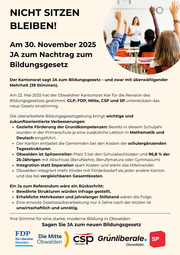 Am 22. Mai 2025 hat der Obwaldner Kantonsrat klar für die Revision des Bildungsgesetzes gestimmt. GLP, FDP, Mitte, CSP und SP unterstützen das